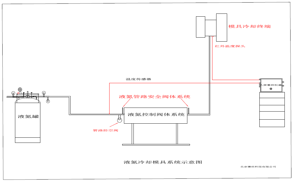 控制系統主要由液氮輸送管路、控制閥體、溫度監控、自動旁通、安全系統等一整套系統整合的自動控制系統組成。液氮輸送管路負責從液氮罐體輸送液氮到控制系統閥體,再輸送到鋁模具端液氮套裝內部。整體系統運行由控制系統來運作。